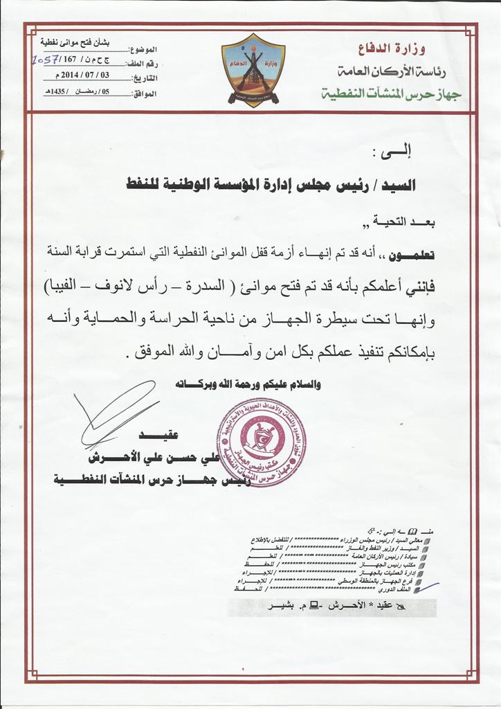 رئيس جهاز حرس المنشآت النفطية العقيد علي الاحرش يؤكد انتهاء أزمة الموانئ النفطية وفتح موانئ ( السدرة – رأس لانوف – الفيبا ) وهي تحت سيطرة الجهاز كما دعا الأحرش المؤسسة الوطنية للنفط إلى تنفيذ عملها بكل أمن وأمان وتحصلت صحيفة ليبيا السلام نسخة من المراسلة بهذا الشأن .