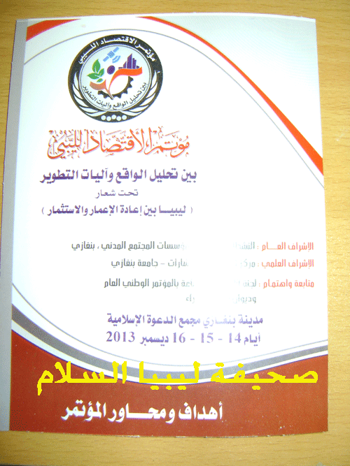 تستضيف مدينة بنغازي مؤتمر الاقتصاد الليبي تحت عنوان(مؤتمر الاقتصاد الليبي بين تحليل الواقع وآليات التطوير) وذلك على مدى ثلاثة أيام في الفترة ما بين 14 إلى 16 من شهر ديسمبر المُقبل وعلى السادة الأفاضل من المختصين الإطلاع والاتصال على الموقع الالكتروني للمؤتمرwww.LEC.com.ly وعبر الموقع الالكتروني للفيس البوك العربي بصفحة المؤتمرEconomiCoference/com.www.facebookوالاتصال بالهاتف المحمول للدكتور محمد فياض رئيس اللجنة العليا للمؤتمر0925104739 ،0913681770 ،والناطق الرسمي للمؤتمر الدكتور خالد الهدار0917482110 .